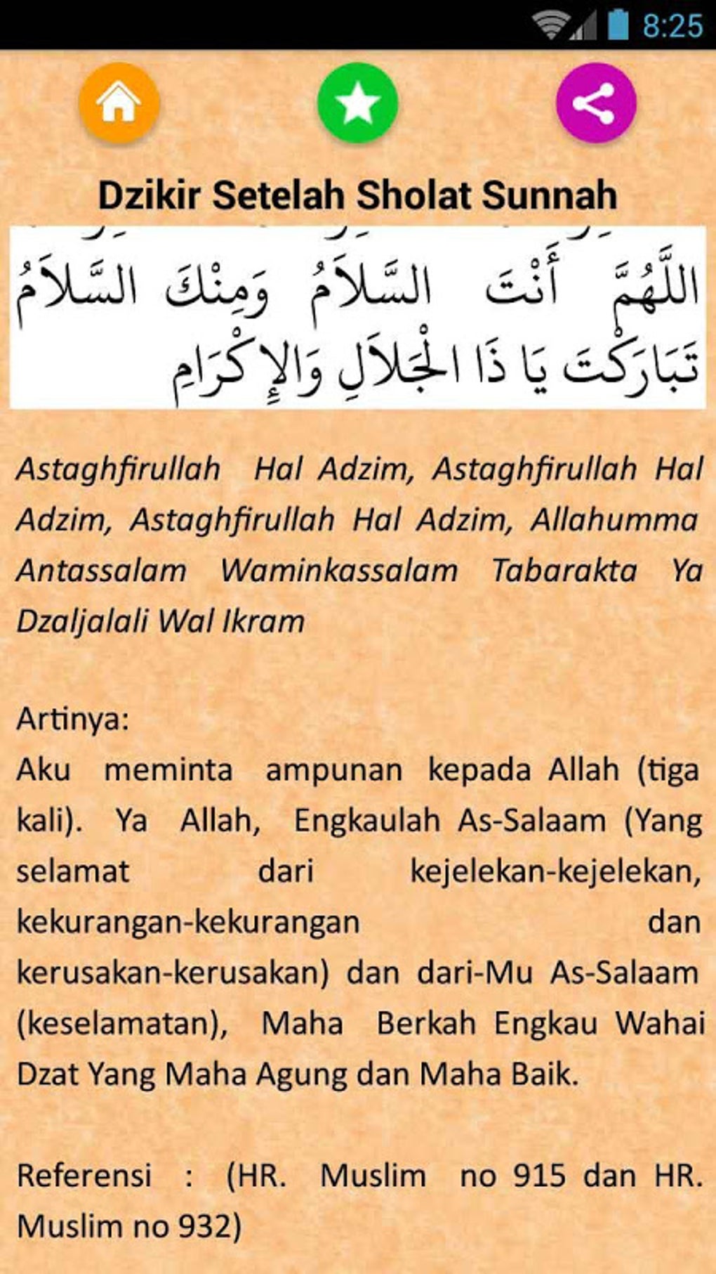 Artinya: “Ya Allah, engkaulah Dzat yang memberi keselamatan (kesejahteraan), hanya darimu lah keselamatan (kesejahteraan) dan kepadamua lah segala keselamatan (kesejahteraan) itu kembali. Maka hidupkanlah kami Ya Allah dengan selamat (sejahtera), masukkan kami ke dalam surga rumah keselamatan (kesejahteraan), Engkaulah Dzat yang berkah wahai Tuhan kami dan maha luhur Engkau, Ya Tuhan kami yang Dzat yang memiliki keagungan dan kemuliaan”. -